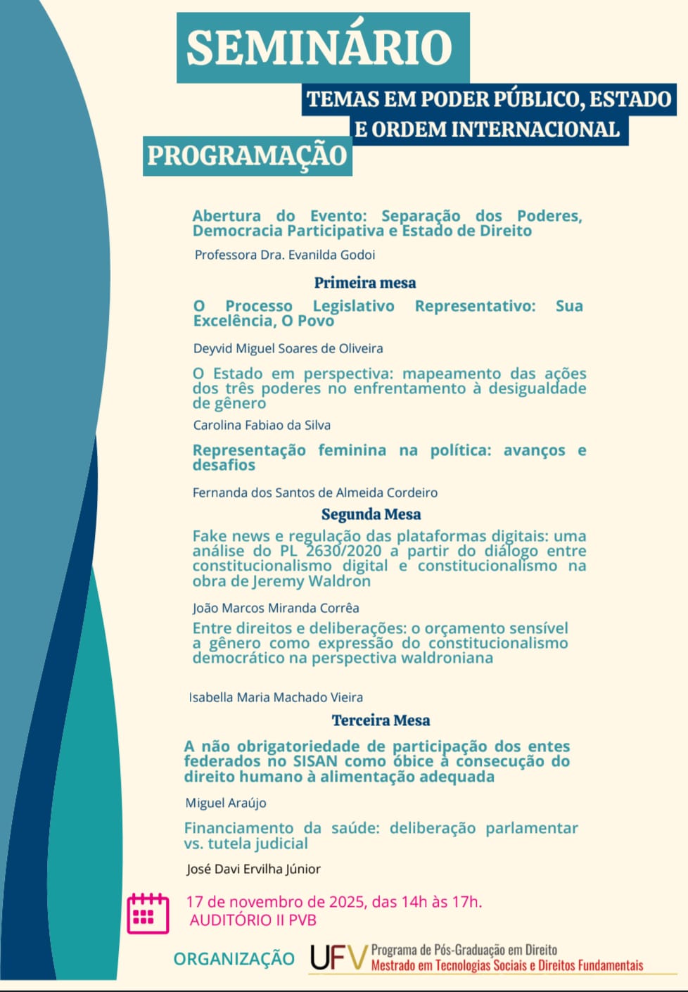 O Programa de Pós-Graduação em Direito da Universidade Federal de Viçosa (UFV), por meio da linha de pesquisa em Tecnologias Sociais e Direitos Fundamentais, convida toda a comunidade acadêmica para participar do Seminário “Temas em Poder Público, Estado e Ordem Internacional”, que será realizado no dia 17 de novembro de 2025, das 14h às 17h, no Auditório II do PVB.